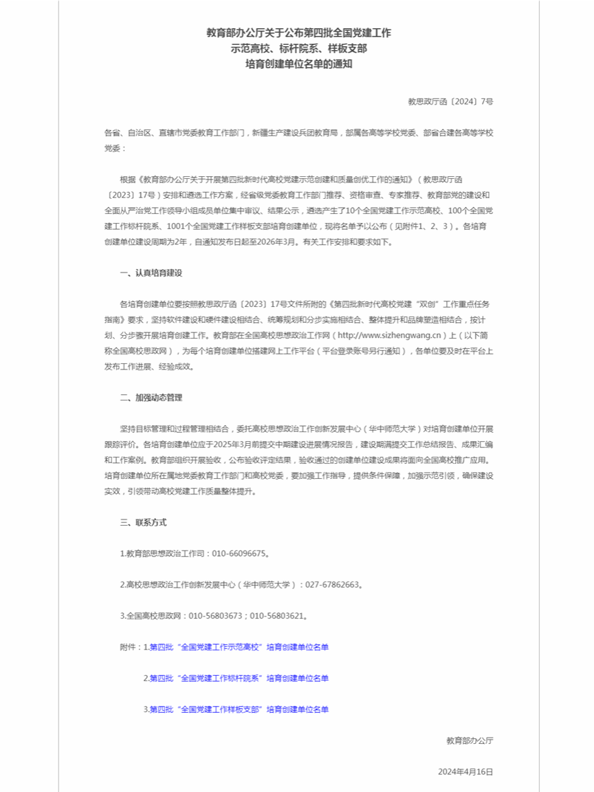 近日,教育部公布第四批新时代高校党建示范创建和质量创优工作(简称“双创”)培育创建单位名单。成人综艺 智能计算系统系第一党支部入选第四批“全国党建工作样板支部”培育创建单位。这是继2021年成人综艺 基础教学部党支部成功获批“全国党建工作样板支部”、2022年学院党委入选“全国党建工作标杆院系”创建之后学院获得的第三项全国党建“双创”荣誉。