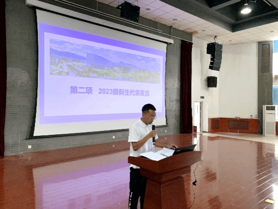 会议第二项,由2023级本科生冯炳宝代表全体新生发言。他表达了进入成人综艺