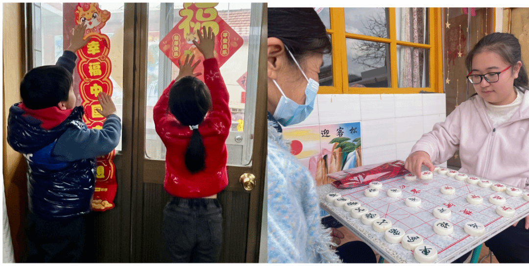 23级本科生焦乐颖深入家乡留守儿童的家庭,与她们共同绘画出一家人团圆饭过年的温馨画面。随后,焦乐颖又与留守儿童组成美好小队,一同前往一名乡村中学的教师黄老师家中,并与老师一起品悦世界名著、贴春联、贴窗花、下象棋、唱歌,诚挚感谢黄教师对乡村儿童的辛勤付出和无私奉献,一系列活动也激发了留守儿童积极向上的斗志和梦想,也让受帮扶儿童新年不孤单,拾起自信,绽放笑脸。