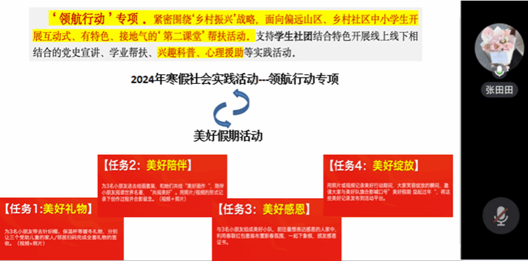 团委线上举办了2024年寒假社会实践动员大会暨经验分享会。会上重点针对本次“美好假期”公益活动,结合2024年寒假社会实践相关通知要求,鼓励同学们将其与寒假社会实践“青担新使命”——“领航行动”专项深度融合,围绕“乡村振兴”战略,面向乡村社区中小学生开展互动式、有特色、接地气的“第二课堂”帮扶活动。