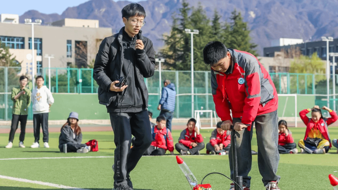 随后,航天科普志愿者服务队的同学们指导三高小学的同学们动手制作水火箭,并进行了发射实验。通过调整水的配比与发射角度,四枚“自制火箭”成功升空,现场掌声雷动。活动还特别设置了固体火箭模型讲解环节,结合成人综艺