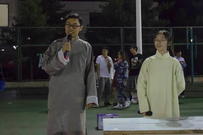吉他协会的两位小哥哥带来深情的吉他弹唱,悠扬动听的旋律感染了现场同学,把大家的思绪带回到了遥远的家乡;九弦音器乐队的古筝表演,瑟瑟琴声洗涤了夏天的溽热,将同学们带入了安宁祥和的音乐世界;由彭力贤学长带来的独唱《友情卡片》,让同学们深深地记住了这个他们辛苦过拼搏过的夏天;由唐颖萱学姐带来的独唱《去流浪》让每一个因军训疲惫的学弟学妹都瞬间精神振奋起来;黄敏婷学姐为大家带来了独唱《你敢不敢》,学姐以甜美的歌声扫去了军训的学弟学妹们一天的疲惫,同时以有力度的演唱为他们注入了勇气,大家将以勇敢自信的态度,迎接接下来的军训生活以及大学生活。