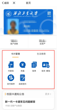 学生可点击“一卡通”进行校园卡相关操作页面,也可直接点击成人综艺右上角“充值”快速进入一卡通充值界面。