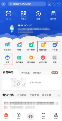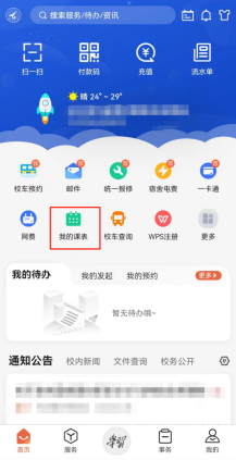 在app上生活服务板块可使用“校车预约”和“校车查询”功能,获知校车运行时刻表、上下车点信息等。