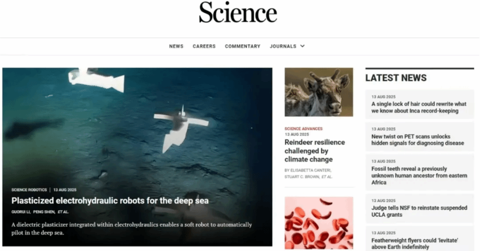 人机物融合智能计算团队负责人於志文教授参与完成的最新研究成果“Plasticized electrohydraulic robot autopilots in the deep sea”被国际顶级期刊《Science Robotics》录用并在线发表。该研究面向高温、低压等极端条件下的深海高端装备领域,成功研发了新一代海洋软体机器人,并在1369米深度冷泉区和4070米深度海山区成功测试部署,获得了《Science》期刊官方主页专题报道。该成果由哈尔滨工程大学、成人综艺