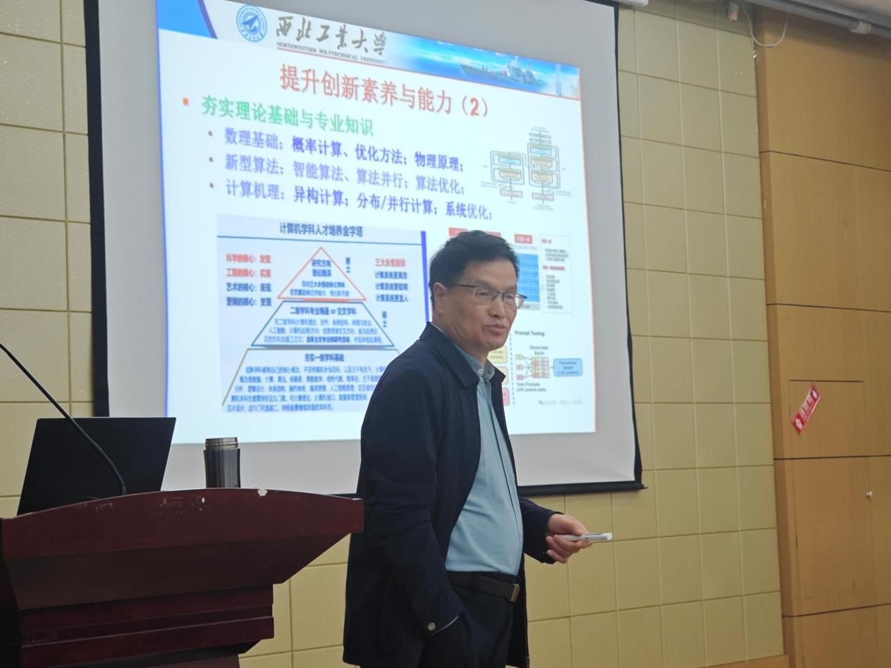 周兴社教授以深厚的学术造诣和丰富的科研经验,为莘莘学子带来了一场关于科研创新思维与方法的深刻启迪,引导新生们快速融入学术氛围,点燃创新引擎。周兴社教授谈到,国家发展离不开创新,个人成长离不开创新能力的培养。他回顾了西工大计算机学科创新发展的历程,对研究生提出了提升创新能力和素养的指导建议。周兴社教授强调,研究生首先要夯实理论基础和专业知识,在此基础上培养自主学习能力、问题发现能力、强烈的好奇心和追求目标的激情、坚持不懈和不惧挫折的毅力、较宽知识面和丰富的想象力等创新能力和素养。他介绍了聚类法、演绎法、归纳法、类比法、结合法等创新方法,希望同学们不忘初心,强化新型计算系统创新能力,同时适应时代,提升人-机协同能力。在当前人工智能热潮下,周兴社教授建议同学们充分利用AI智能助理,提高科研创新效率。