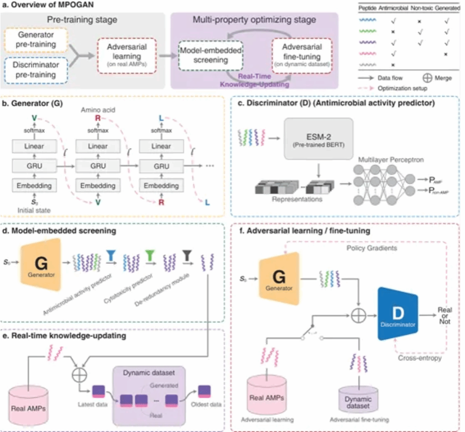 抗菌肽(AMP)是一类具有抗菌活性的小分子多肽药物,由于其广谱抗菌特性且不易诱导细菌产生耐药性,AMP成为应对全球细菌耐药性问题的重要研究方向。然而,AMP从头设计领域目前仍面临诸多挑战。实验室合成AMP的过程耗时且成本高昂;且抗菌肽不同属性之间可能存在冲突,使得现有计算方法难以同时优化多种目标特性(如抗菌活性、低毒性和序列多样性等)。为了解决这些挑战,该论文提出了面向抗菌肽多属性同步优化的生成对抗网络(MPOGAN)。通过设计嵌入式和串联式的属性评估器,筛选生成模型生成的高质量肽序列,并提出实时知识更新(RTKU)策略,动态更新训练数据集,从而迭代学习肽序列与多种治疗属性之间的关系,使生成模型逐渐具备生成具有多种优良属抗菌肽的能力。实验结果表明,MPOGAN在生成满足多种目标属性(高抗菌活性、低毒性和序列多样性)的抗菌肽方面优于现有方法。通过与成人综艺