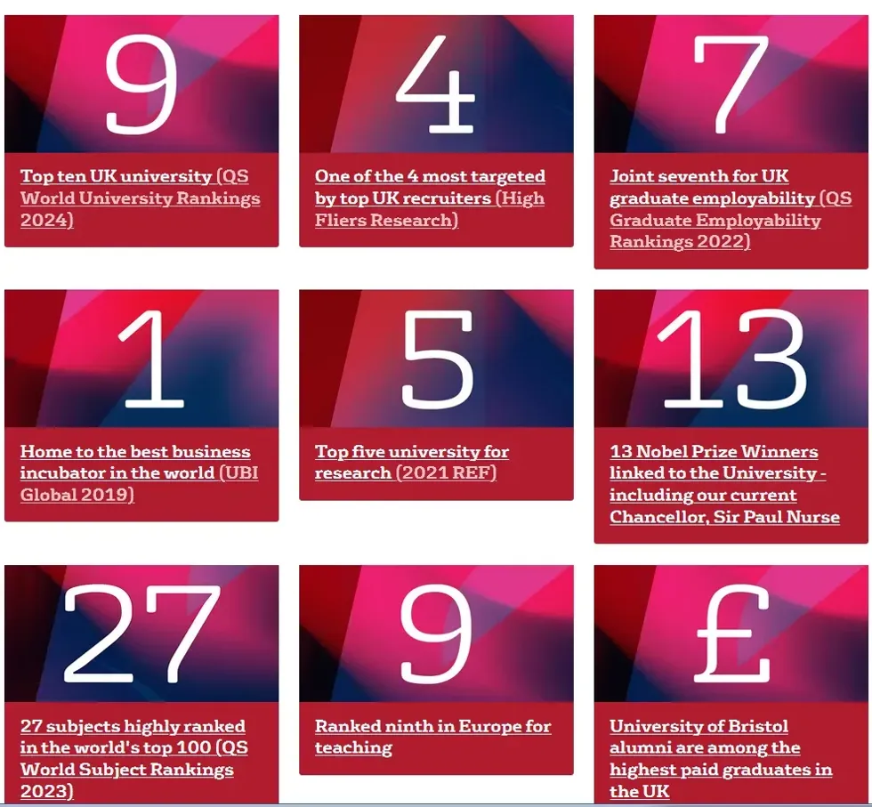布里斯托大学(University of Bristol),简称“布大”,始建于 1876 年,位于英格兰西南部被誉为“欧洲硅谷”的布里斯托市,世界排名第54位(QS2025)、是世界一流研究型大学及英国著名的六所红砖大学之一。布里斯托大学拥有众多学术界教授和校友,其中包括 47 位皇家学会研究员、17 位英国科学院研究员、13位诺贝尔奖获得者。布里斯托大学被评为全英科研质量最好的五所顶尖研究型大学之一,其工程学院素有“工程王国”之称。