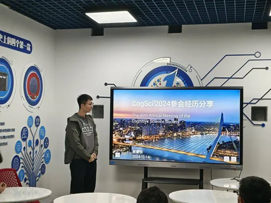 郝肇铁对CogSci2024的参会经历做了分享。CogSci (Annual Meeting of the Cognitive Science Society),即认知科学年度会议。会议目的在于推动认知科学的发展,并促进各研究领域(包括人工智能、神经科学、语言学、心理学、哲学和教育学)的交叉融合与科学交流,是中国计算机学会推荐的权威学术会议(CCF B类)。在分享中,郝肇铁从自身的感悟出发,指出本次参会不仅给自己带来了丰富的学术内容,也提供了广泛的交流机会。同时,郝肇铁也鼓励参会同学积极参加学院提供的国际化项目以提升全球视野。