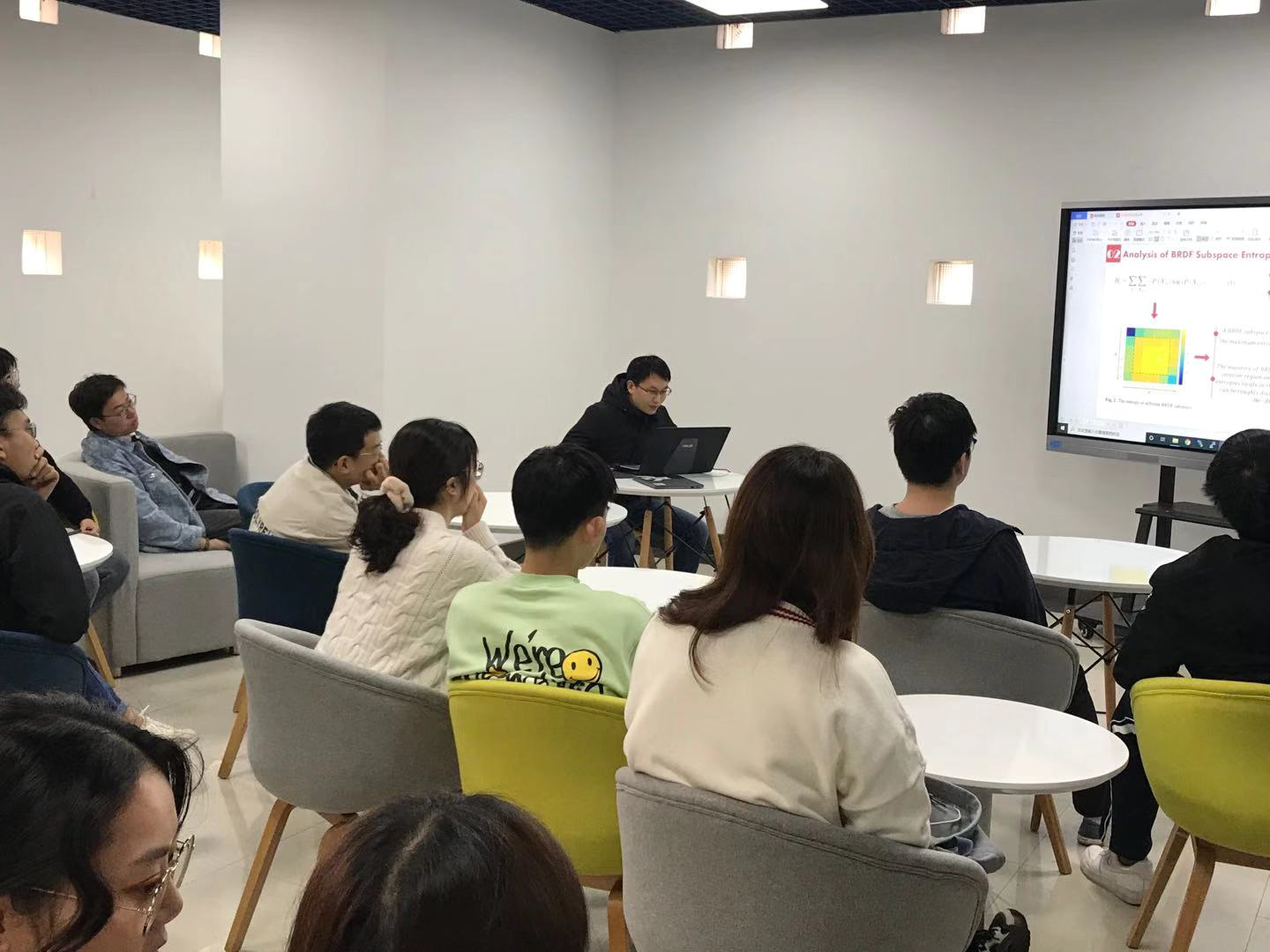 郎智强的论文主要针对光谱超分辨任务,提出使用若干异构的基函数,并通过一个混合函数来为不同像素点预测一个组合系数,从而实现不同像素点的差异化处理。随后,他和大家分享了一些参加国内外学术会议的经验与心得。胡钟昀首先介绍了BRDF的定义及其应用,接着总结了获取BRDF的若干方法,然后分析BRDF子空间熵的分布特性并提出一种新的网络结构,最后比较了各算法的优劣性。他鼓励同学们积极向国际会议投稿,了解专业研究前沿,开阔视野。