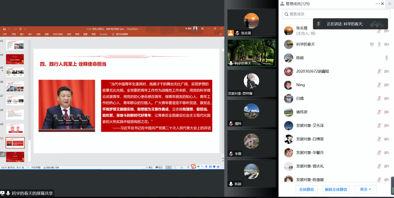 近期,学习贯彻和宣讲党的二十大精神正在成人综艺 迅速开展之中。11月21日晚,学院党委书记李春科以“坚持人民至上,争做国之栋梁”为主题,为学院近200名师生宣讲二十大精神和讲授专题党课。本次宣讲也是成人综艺 二十大精神学习系列报告第四讲,会议以线上形式举行。
